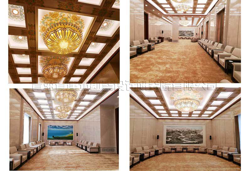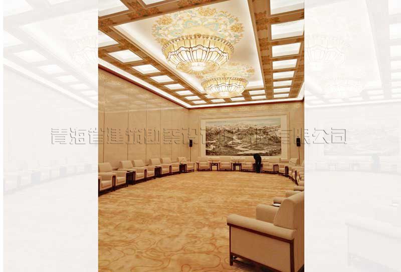 人民大會堂青海廳根據全國人民大會堂管理局安排重新調整位置,需要重新裝修改造。新青海廳位于人民大會堂Ⅱ段三層東南角,北側與人民大會堂金色大廳和三層小禮堂相對,南側面向人大辦公樓內院。位置與金色大廳和小禮堂位置靠近,原功能為領導人休息廳。青海廳總建筑面積350平方米,會議廳平面尺寸為29.3米×8.0米狹長的空間,建筑內表面積為222.68平方米,廳內原設計設變形縫,中間約2/5處設框架柱,吊頂高度5.0米左右,周邊設有服務間、衛生間、配電間等服務設施。原裝修為2000年裝修改造工程。廳室尺寸為一狹長空間,長寬比達到1:3.67,空間比例很不協調,為改造裝修工程帶來較大的難度,也是改造工程的重點。
